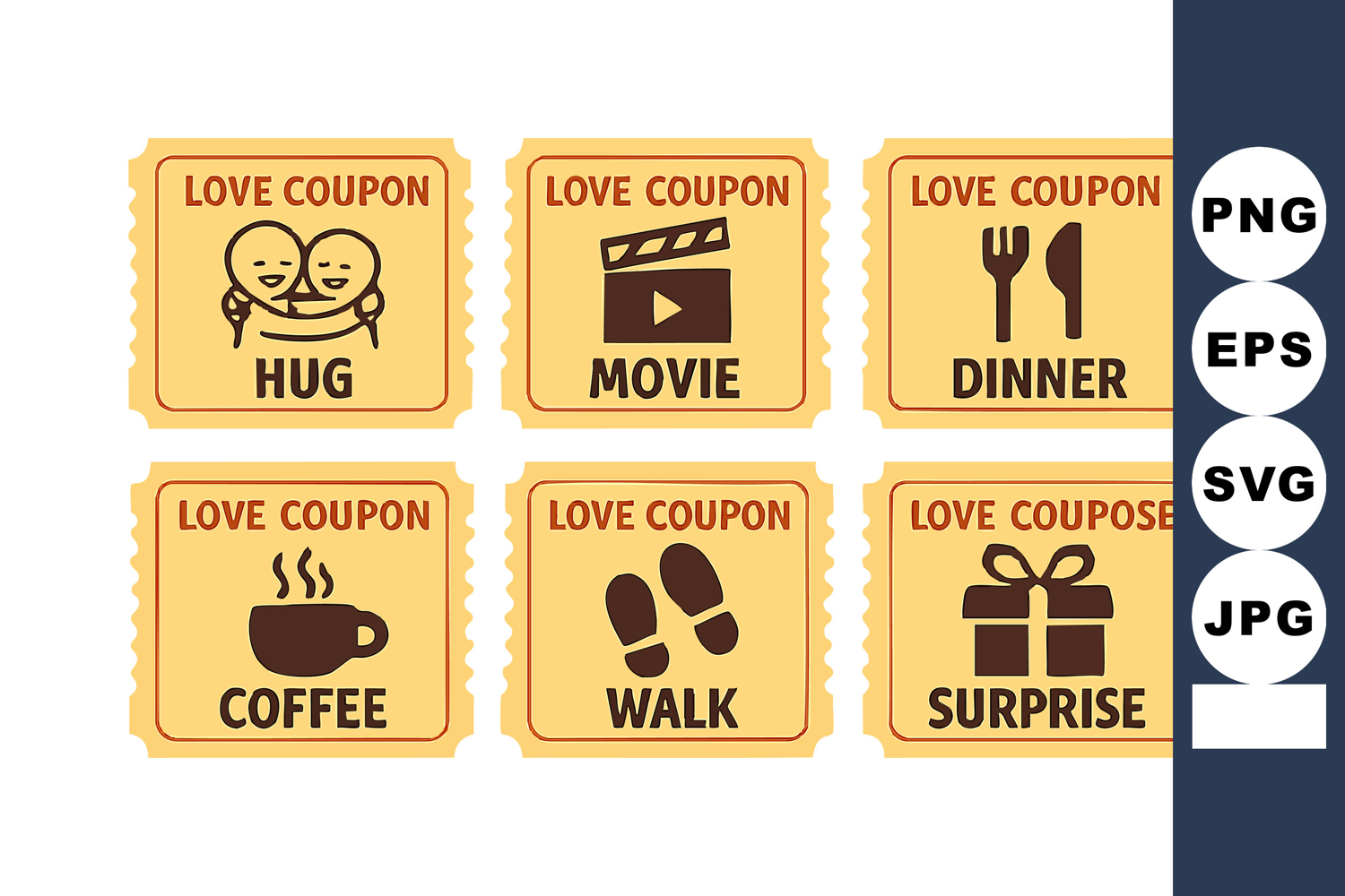 Vector love coupons featuring icons of hugging, movie watching, dinner, coffee, walking, and surprise gifts designed for romantic gestures and relationship bonding, cheerful mood.