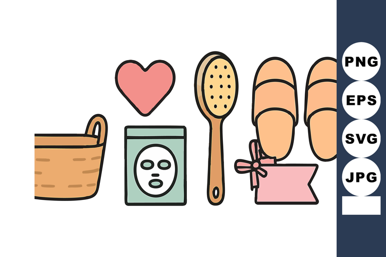 Illustration shows spa essentials including a heart, facial mask, wooden brush, slippers, basket, and gift tag, symbolizing wellness and self care in a calm atmosphere.
