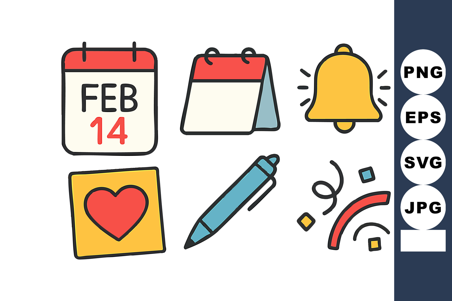 Vector icons showing Valentine’s Day calendar, heart note, pen, bell, and confetti. These symbols represent love and celebration with colorful and simple style. Cheerful mood.
