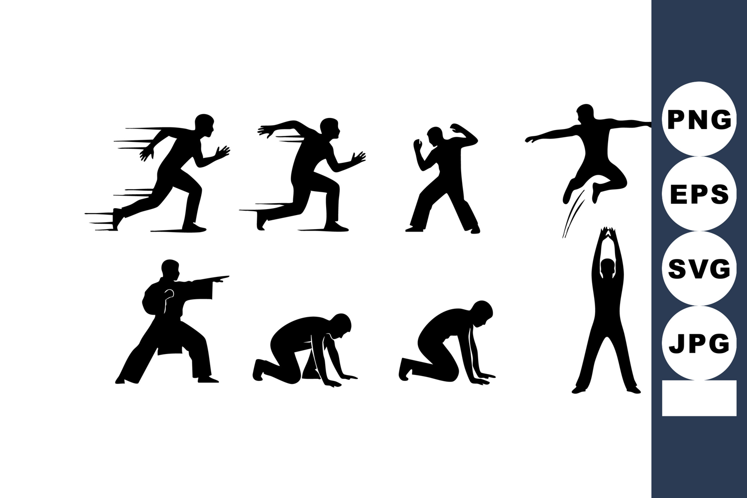 Set of human silhouettes shows various athletic movements, including running, jumping, stretching, and martial arts, arranged on white background, energetic mood.