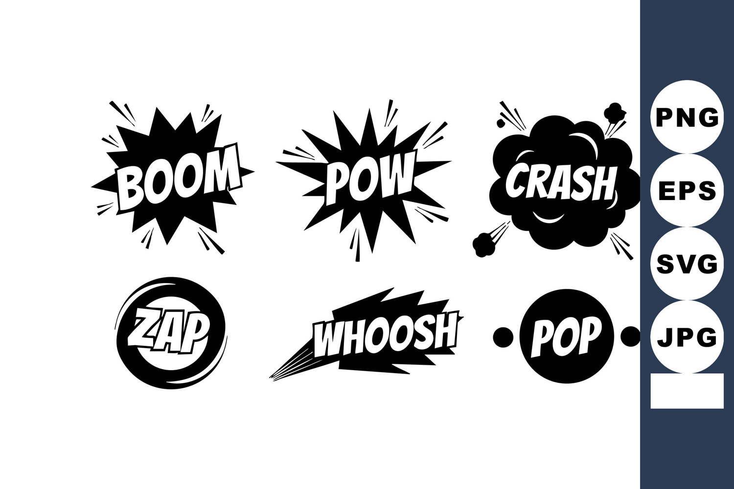This vector displays comic book sound effect icons with bold text and graphic bursts, using black and white for dramatic, energetic mood.