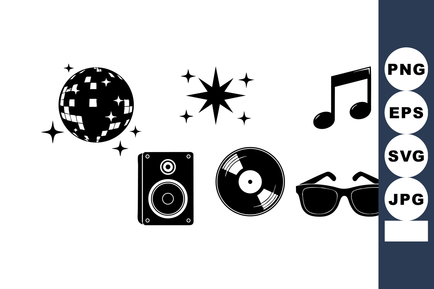 Disco party music symbols with disco ball, speaker, vinyl re example image 1