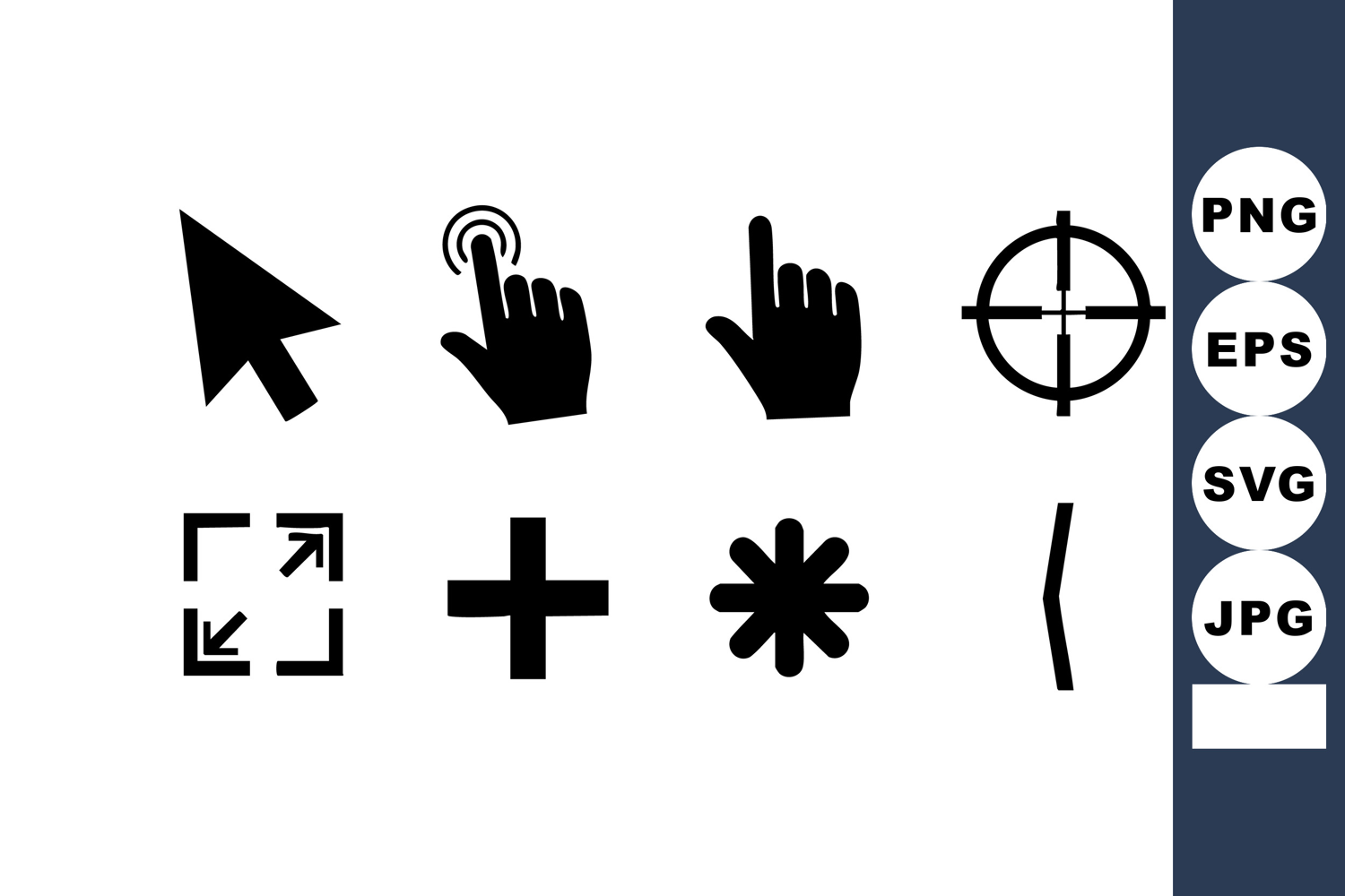 This vector illustration features computer mouse pointer, hand icons, crosshair, plus sign, resize arrows, asterisk, and parenthesis, appearing digital and simple.
