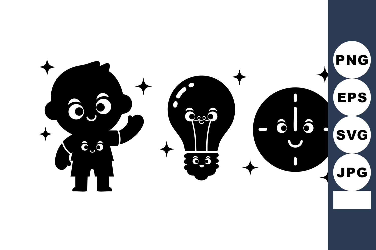 The image shows a cheerful cartoon child, happy light bulb, and smiling clock, all with expressive faces and sparkling stars, creating a playful mood.