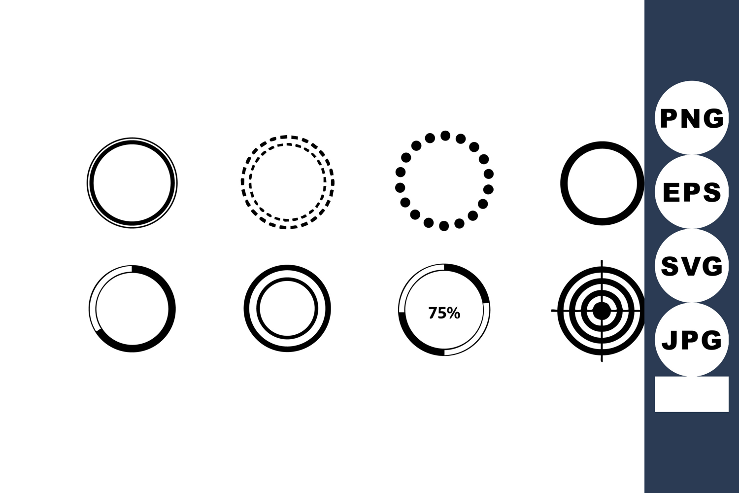 This vector set features eight circular progress bar elements in black and white, ideal for user interface or dashboard design. Modern mood.