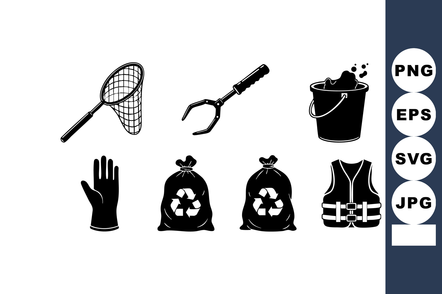 This vector set shows cleanup tools including net, grabber, bucket, glove, recycling bags, and vest, promoting environmental action. Practical mood.