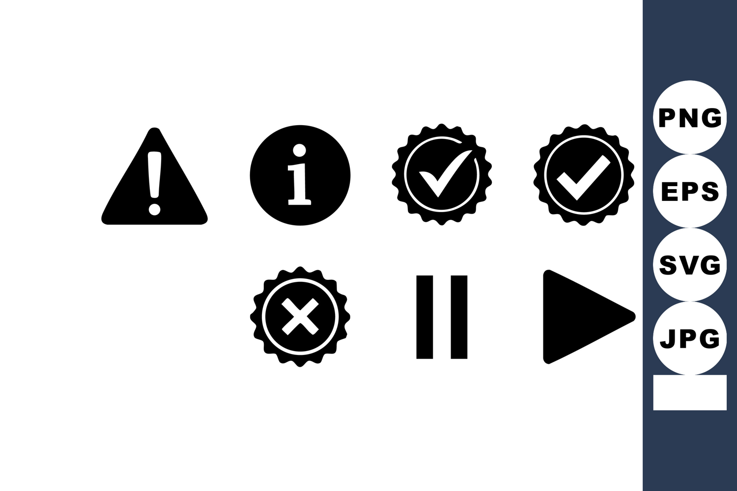 This vector file features black minimalist user interface icons including warning, information, check, cross, play, and pause symbols, creating a modern, clear mood.