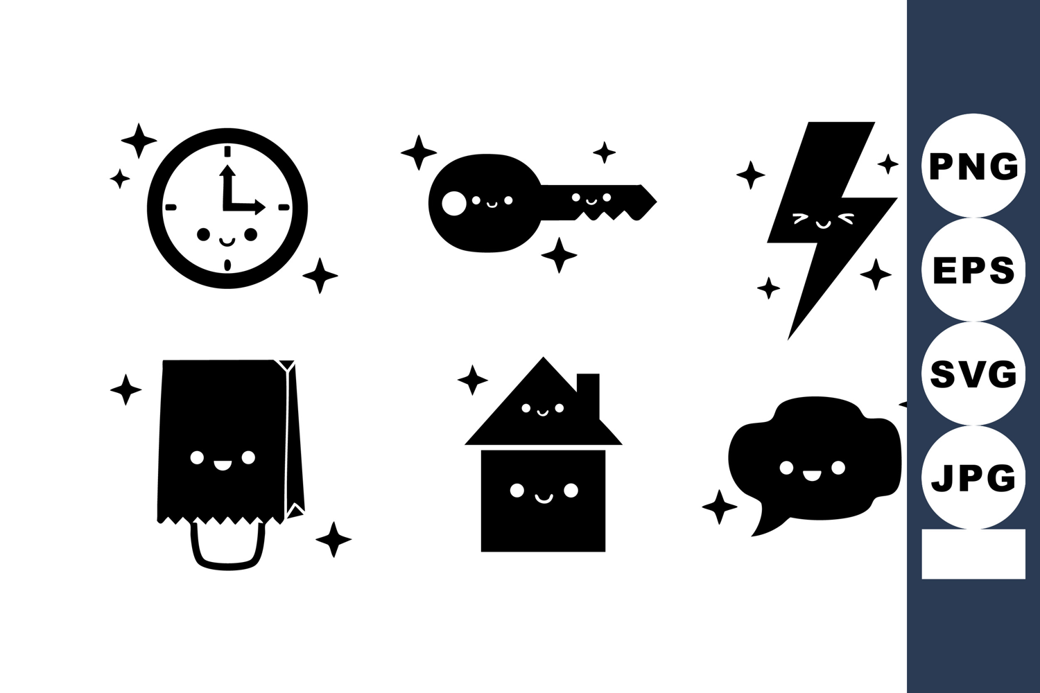 This vector set presents six minimalist icons with cute faces, including clock, key, lightning, bag, house, chat bubble, sparkling, playful.