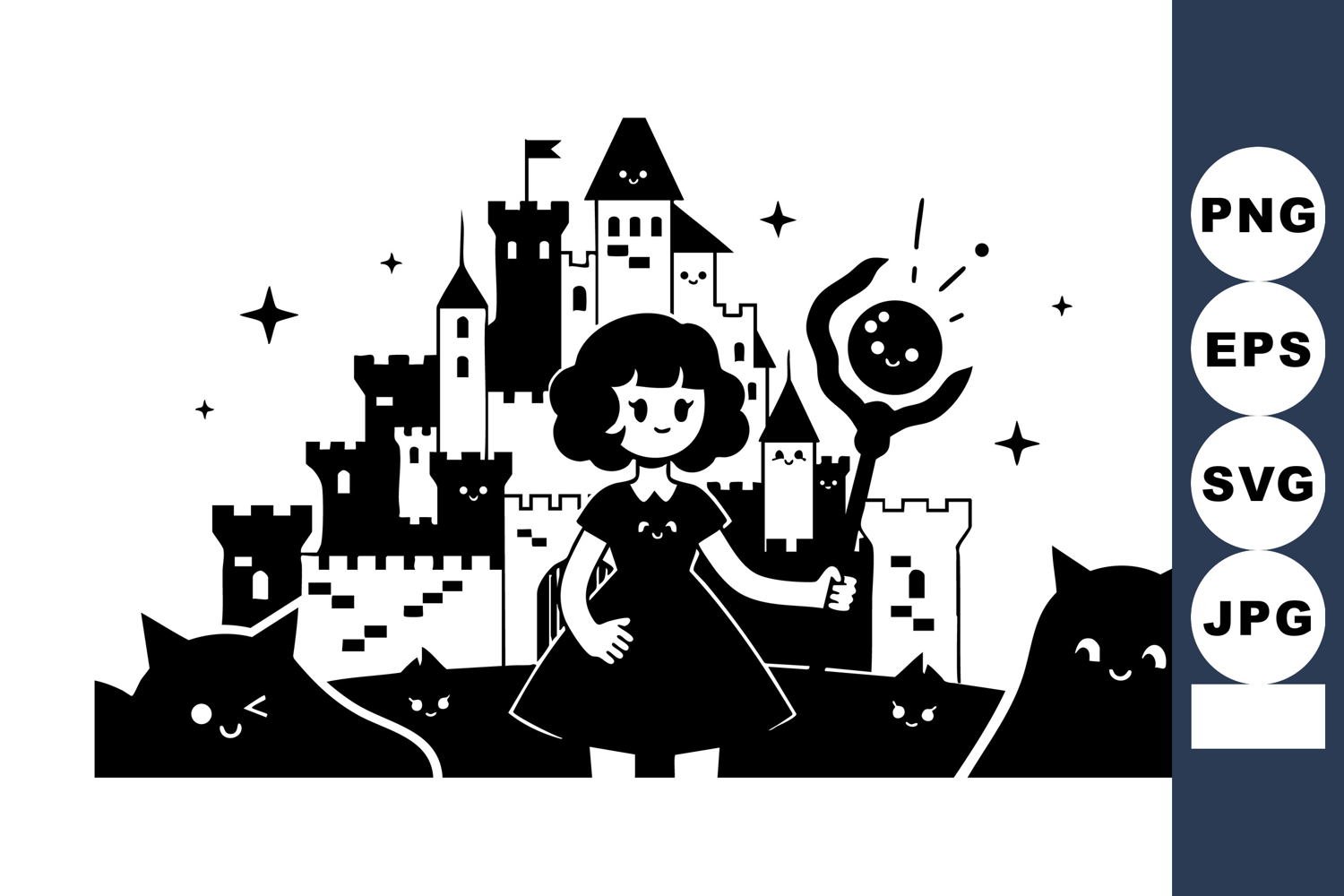 A witch girl stands confidently with black cats and a magical staff, in front of a whimsical castle, creating a mysterious, enchanting mood.