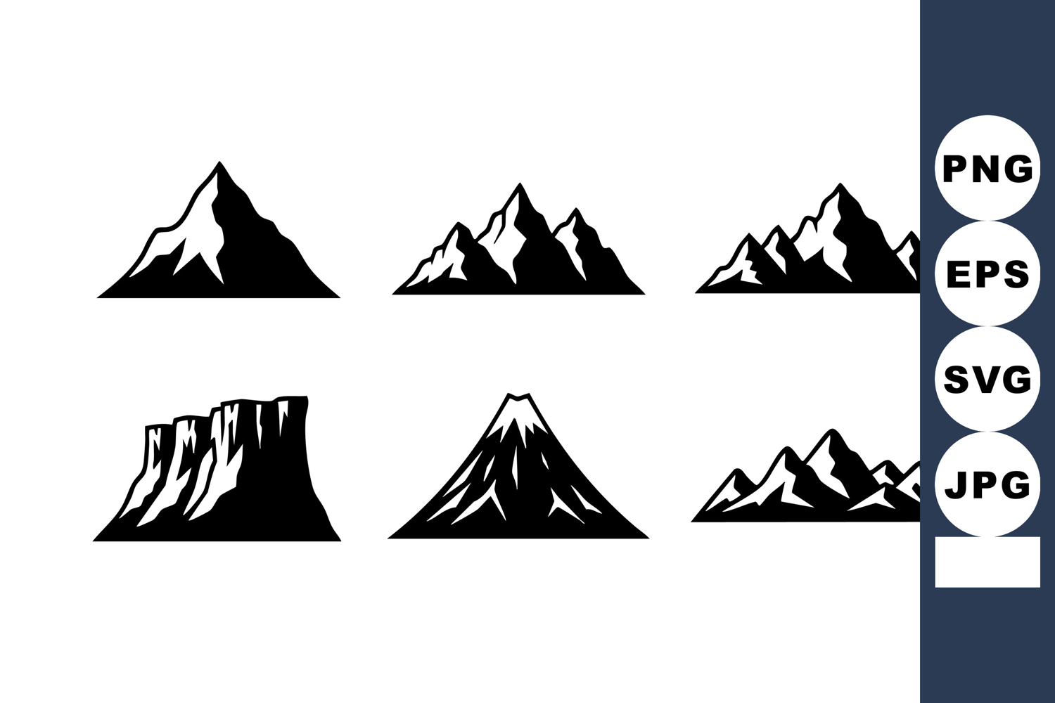 This vector features six distinct mountain silhouette icons in black and white, ideal for landscape, logo, or outdoor themed graphic use. Bold.