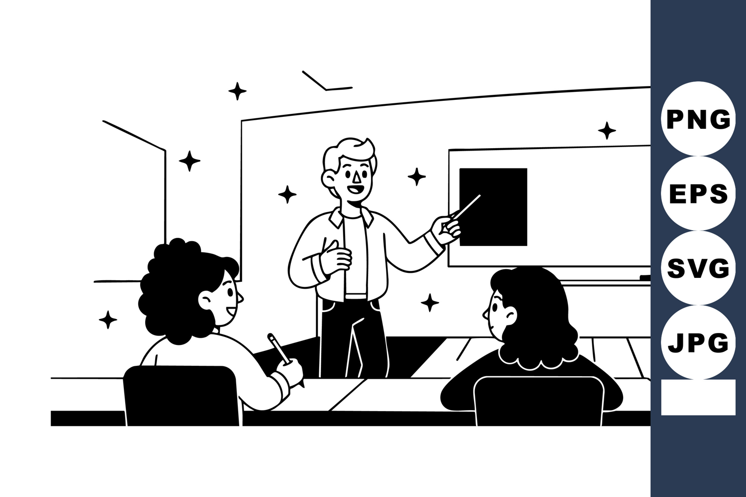 Teacher stands at front of classroom, holding pointer, explaining lesson to two attentive students near chalkboard, black and white, calm mood.