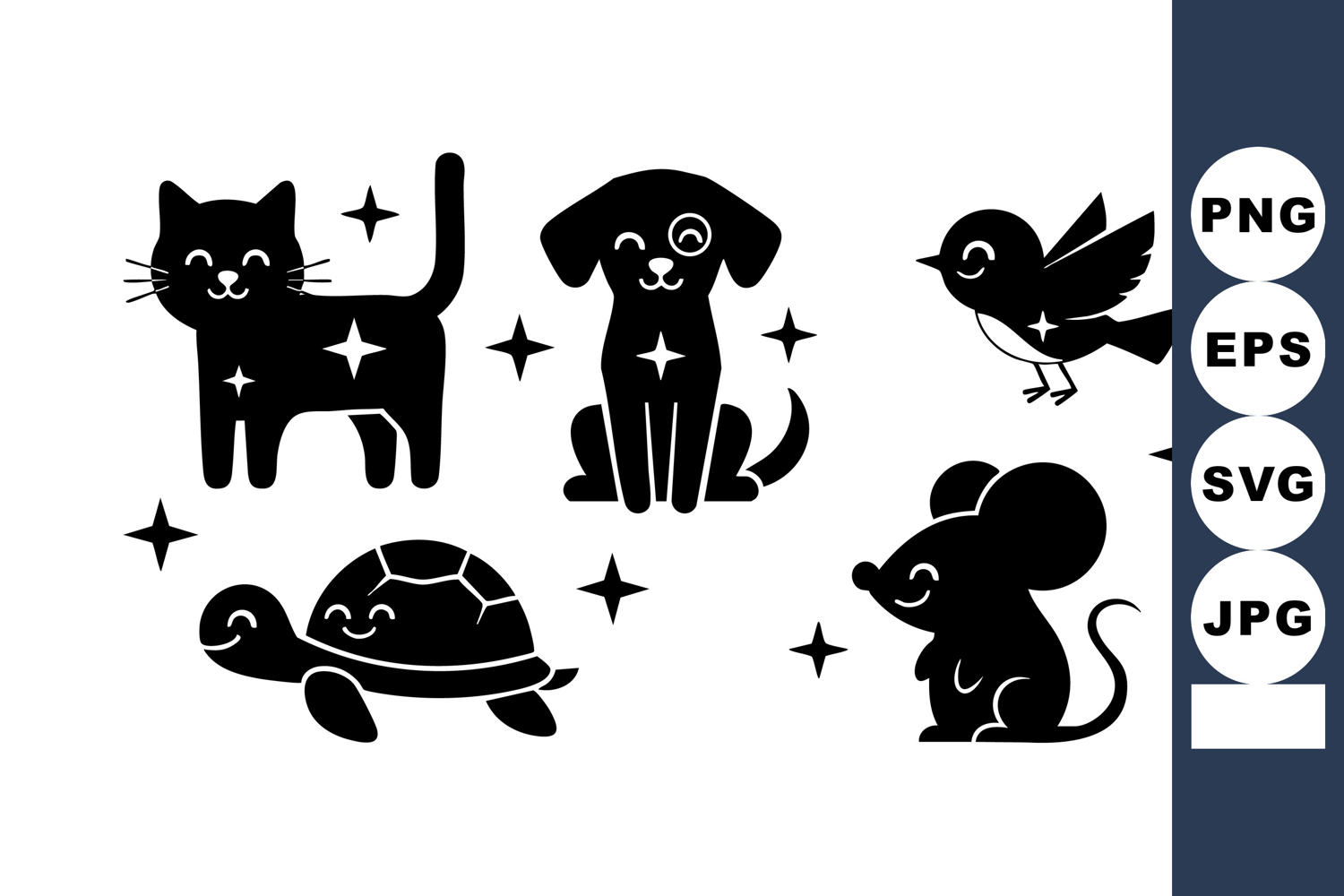 This vector shows charming silhouettes of a cat, dog, bird, turtle, and mouse surrounded by stars, evoking a whimsical and cheerful mood.