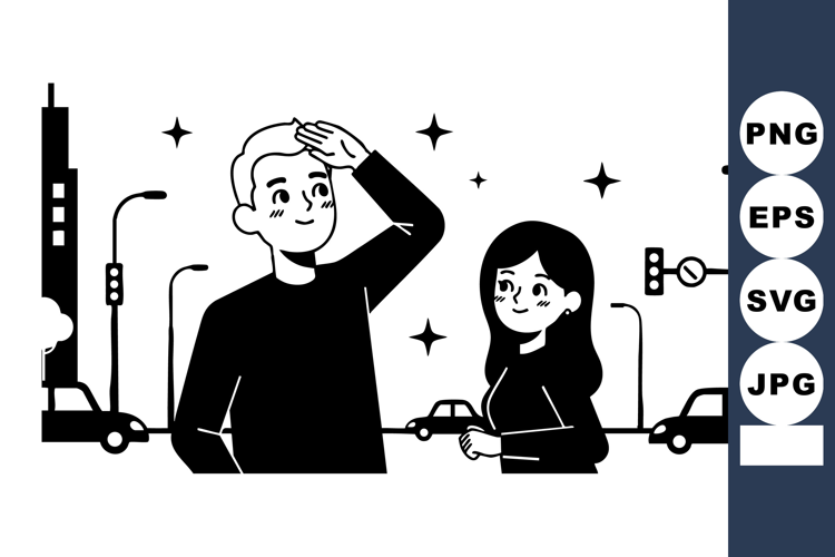 Two people walk together along a city street with cars, traffic lights, and buildings under night sky, appearing cheerful.