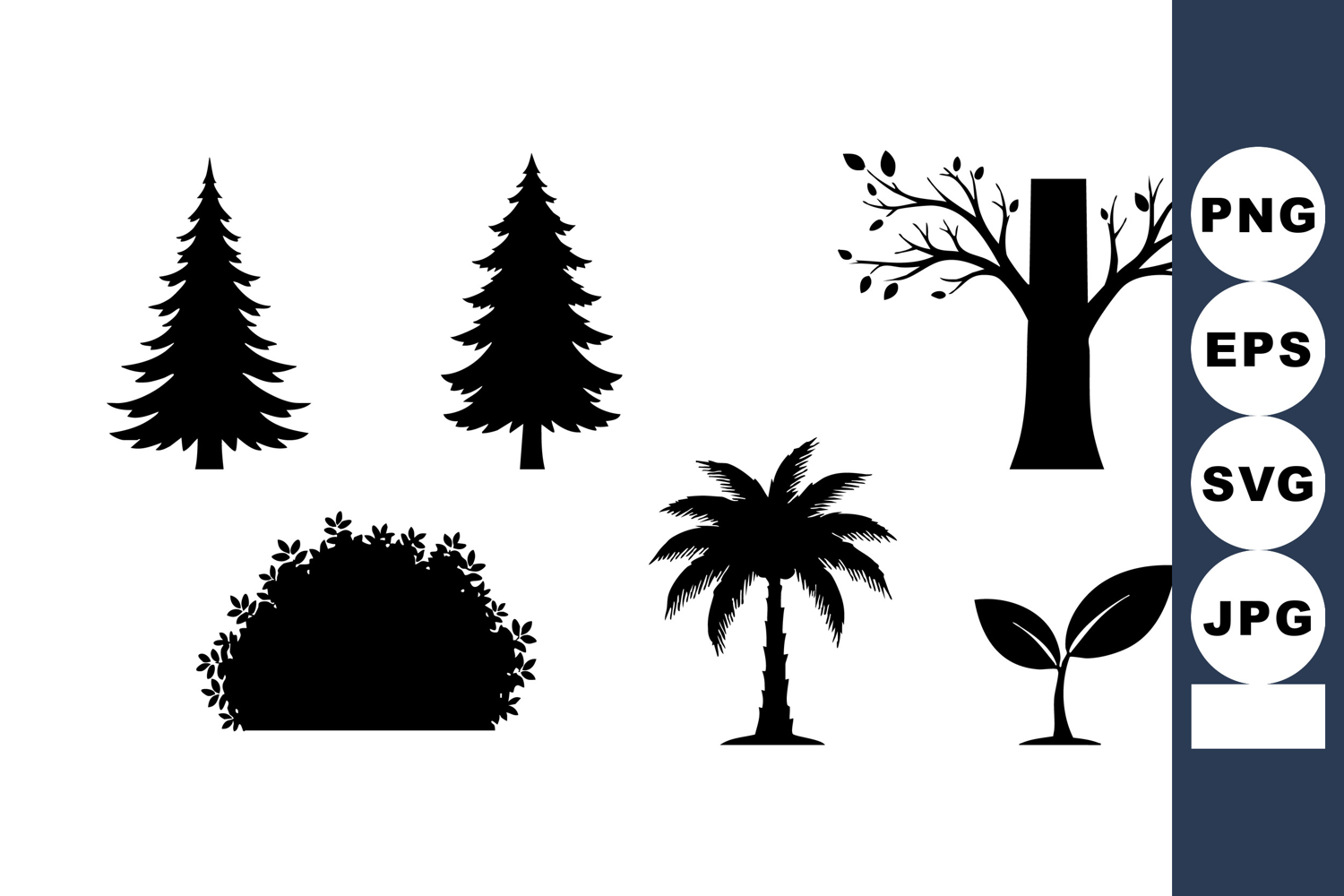 Silhouette set of pine tree, palm tree, bush, leafy tree, an example image 1