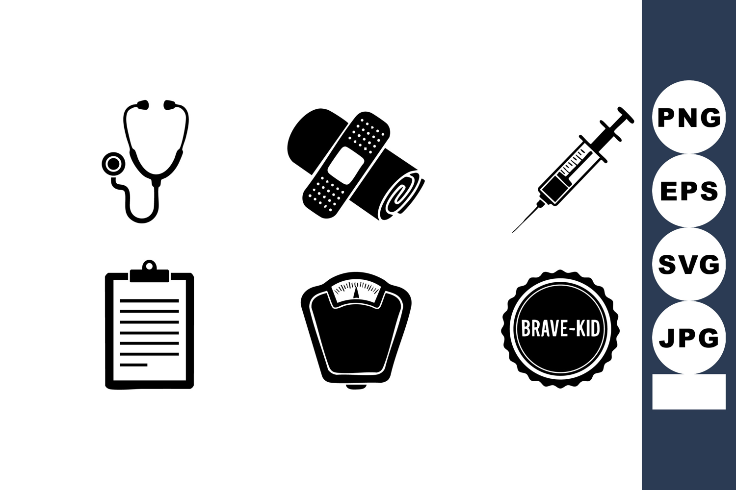 This set features six black medical icons including stethoscope, syringe, bandage, clipboard, weighing scale, and brave kid badge. Simple mood.