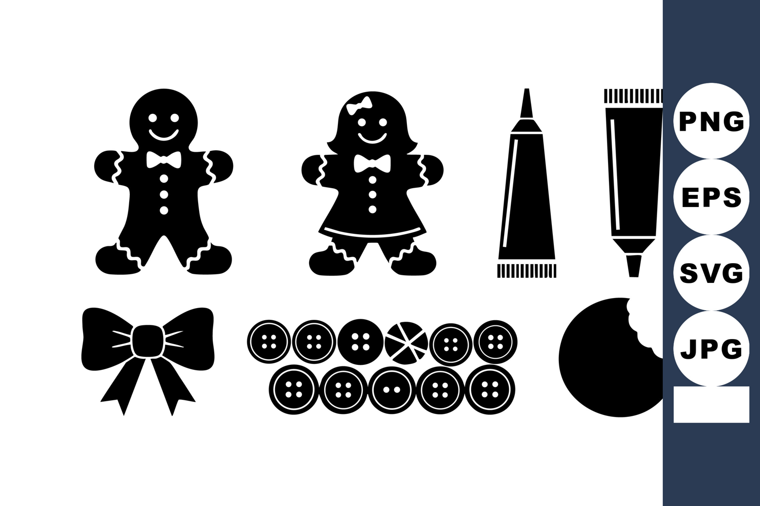 This vector features gingerbread cookie couple, frosting tubes, buttons, bow, and bitten cookie, all in black silhouette style. Playful mood.