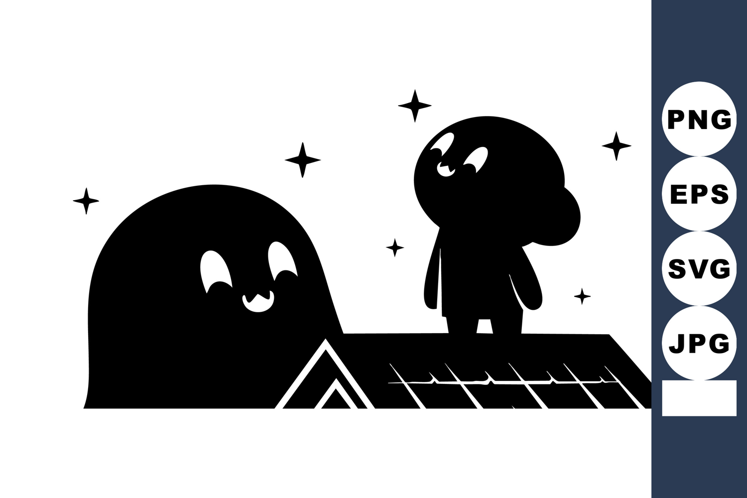 Similar Design Products to Cartoon character stands on rooftop with smiling ghost and s