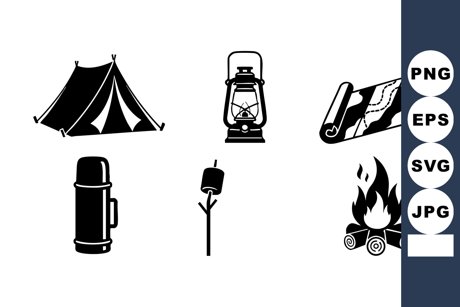 Camping equipment tent lantern map thermos marshmallow campf example image 1