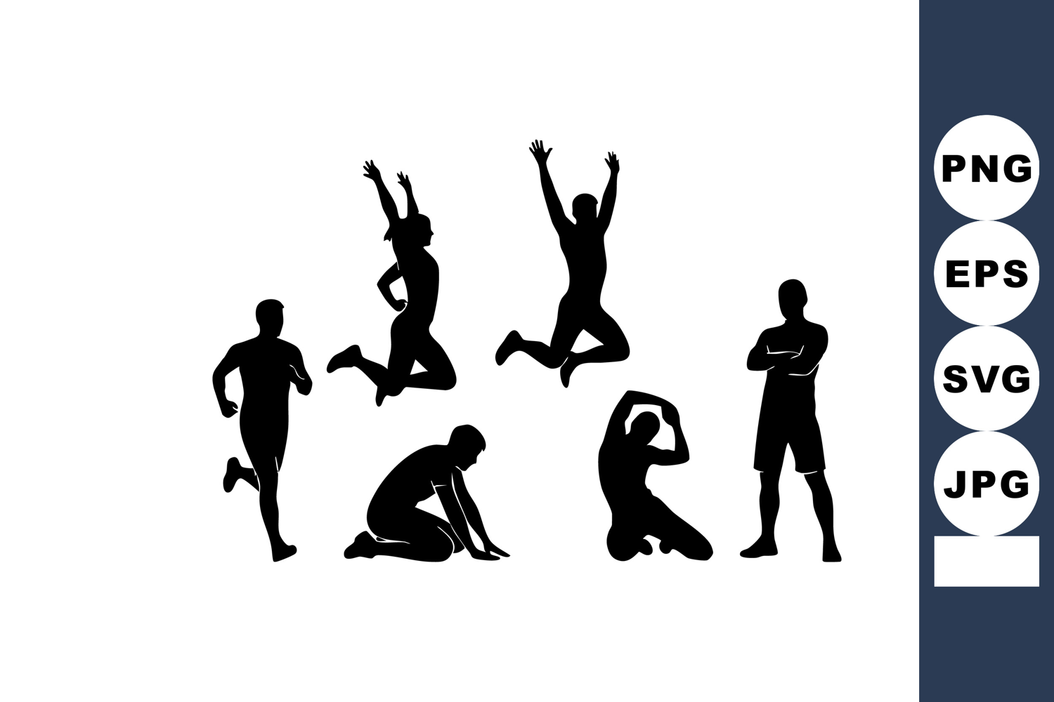 This vector shows silhouettes of athletic people in various energetic poses and movements, creating a sense of liveliness. Energetic mood.