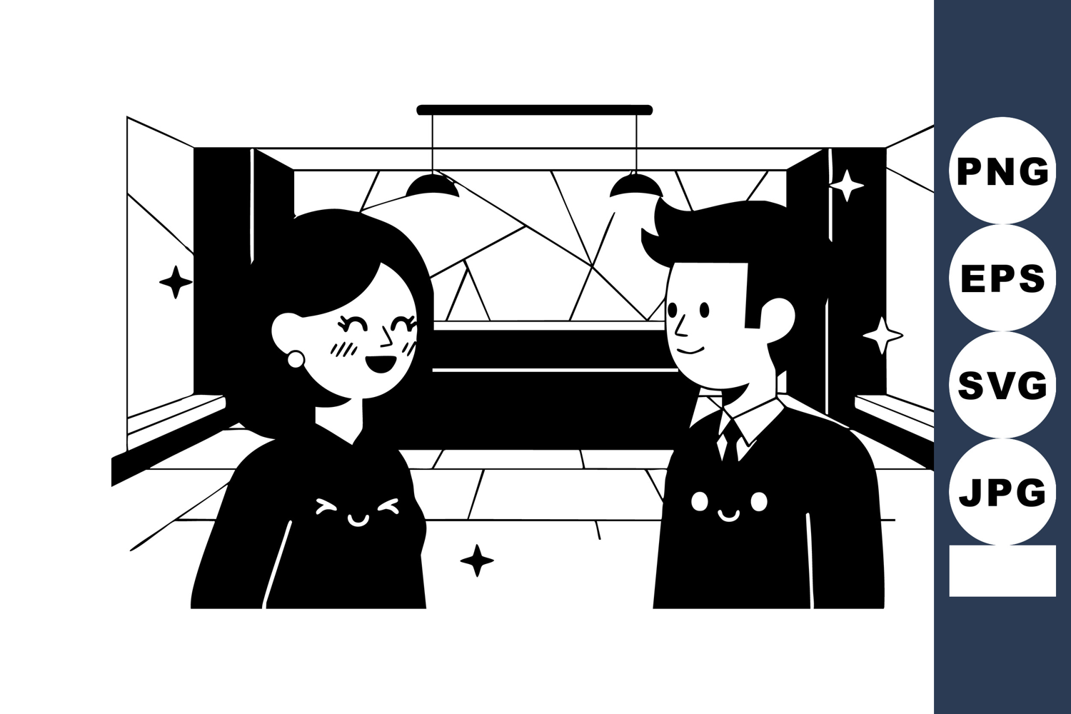 Two people stand smiling in a geometric interior with pendant lighting, minimalist style, black and white, clean and cheerful mood.