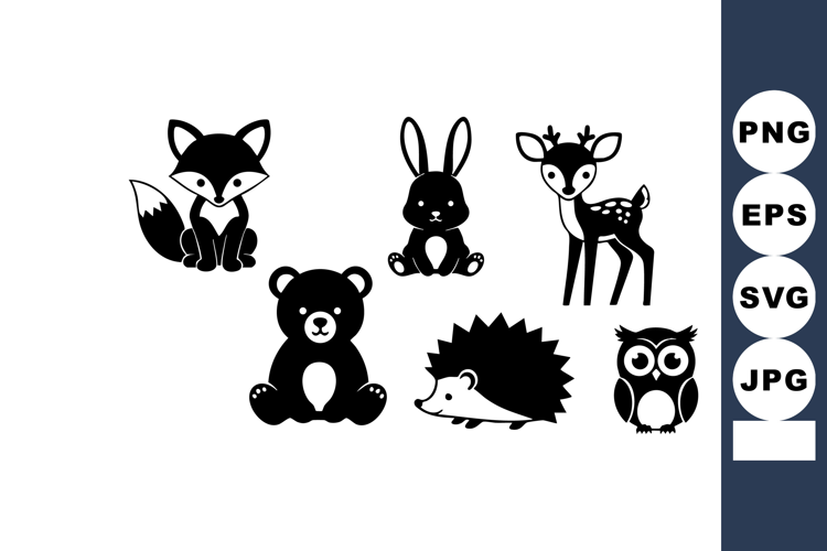 This vector shows cute forest animals including fox, rabbit, deer, bear, hedgehog, and owl in black and white, cartoon mood.