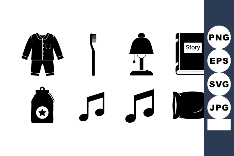 This vector set shows bedtime routine essentials including pajamas, toothbrush, lamp, storybook, milk, music notes, and pillow in a simple style. Calm mood.