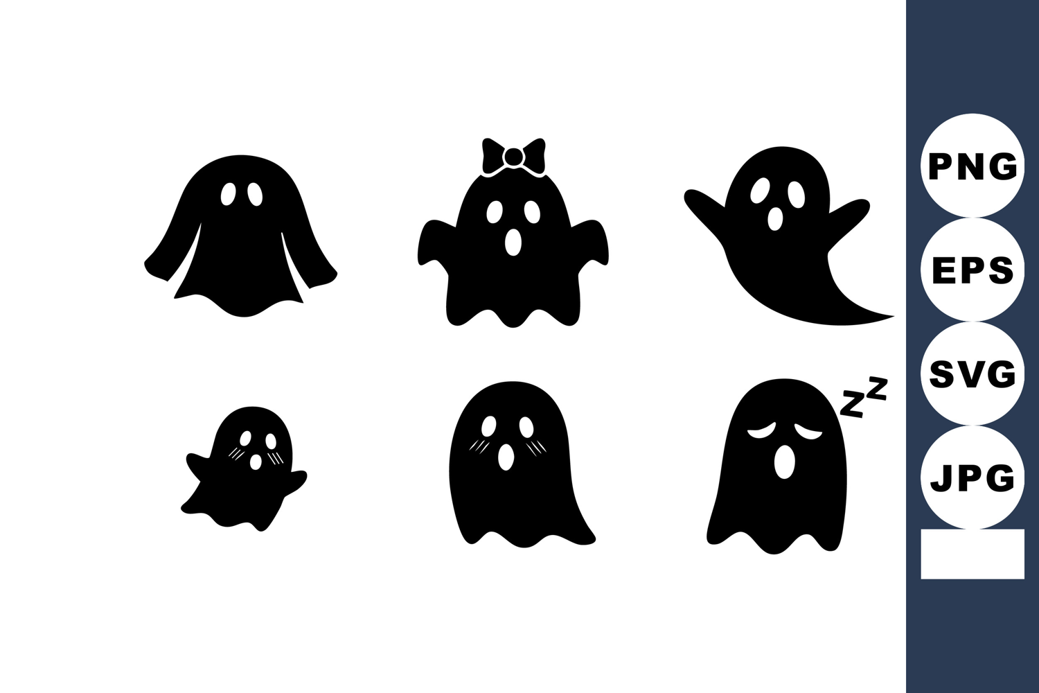 Six black ghost characters appear in playful and sleepy poses, ideal for Halloween themes. Whimsical, festive, and fun mood.