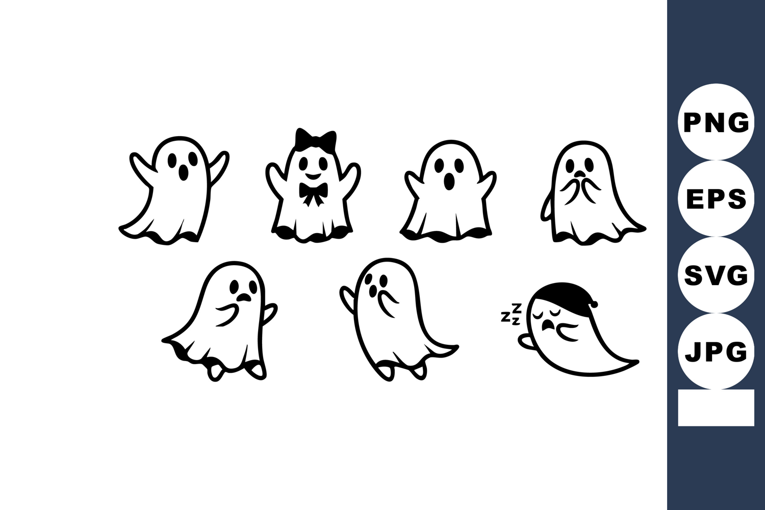This vector shows adorable cartoon ghosts with different facial expressions and poses, perfect for Halloween themes. Playful and whimsical mood.