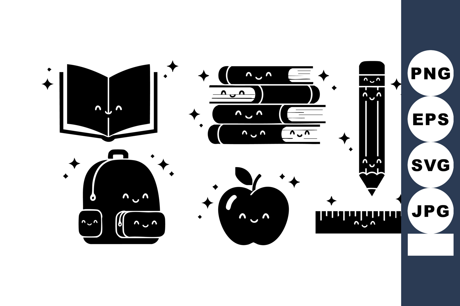 This vector features school supplies with adorable smiling faces, including books, backpack, apple, pencil, and ruler, evoking a cheerful mood.