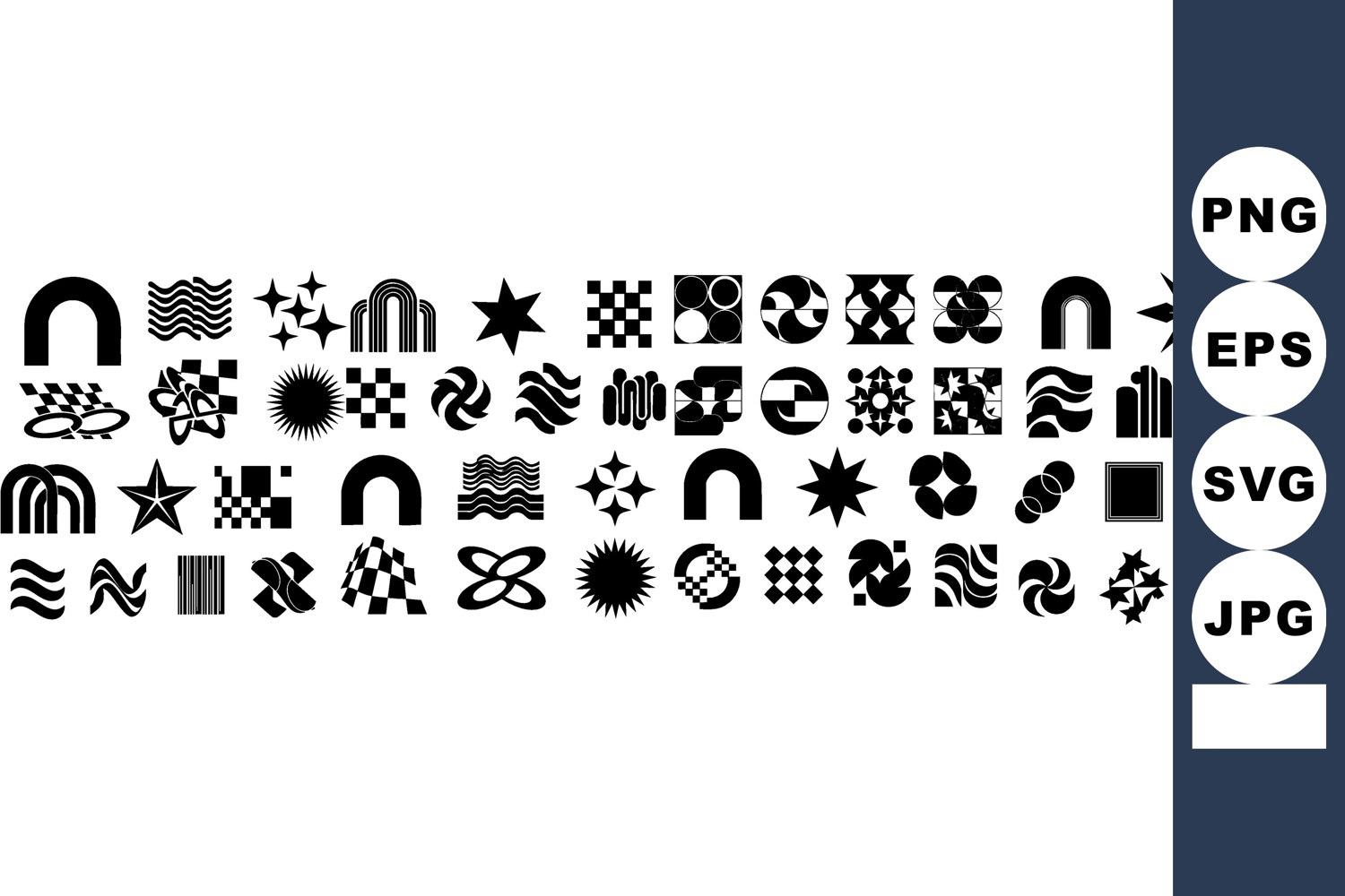 This vector file features multiple abstract geometric shapes with wavy lines, stars, and checkerboard patterns in a bold black and white style. Modern.