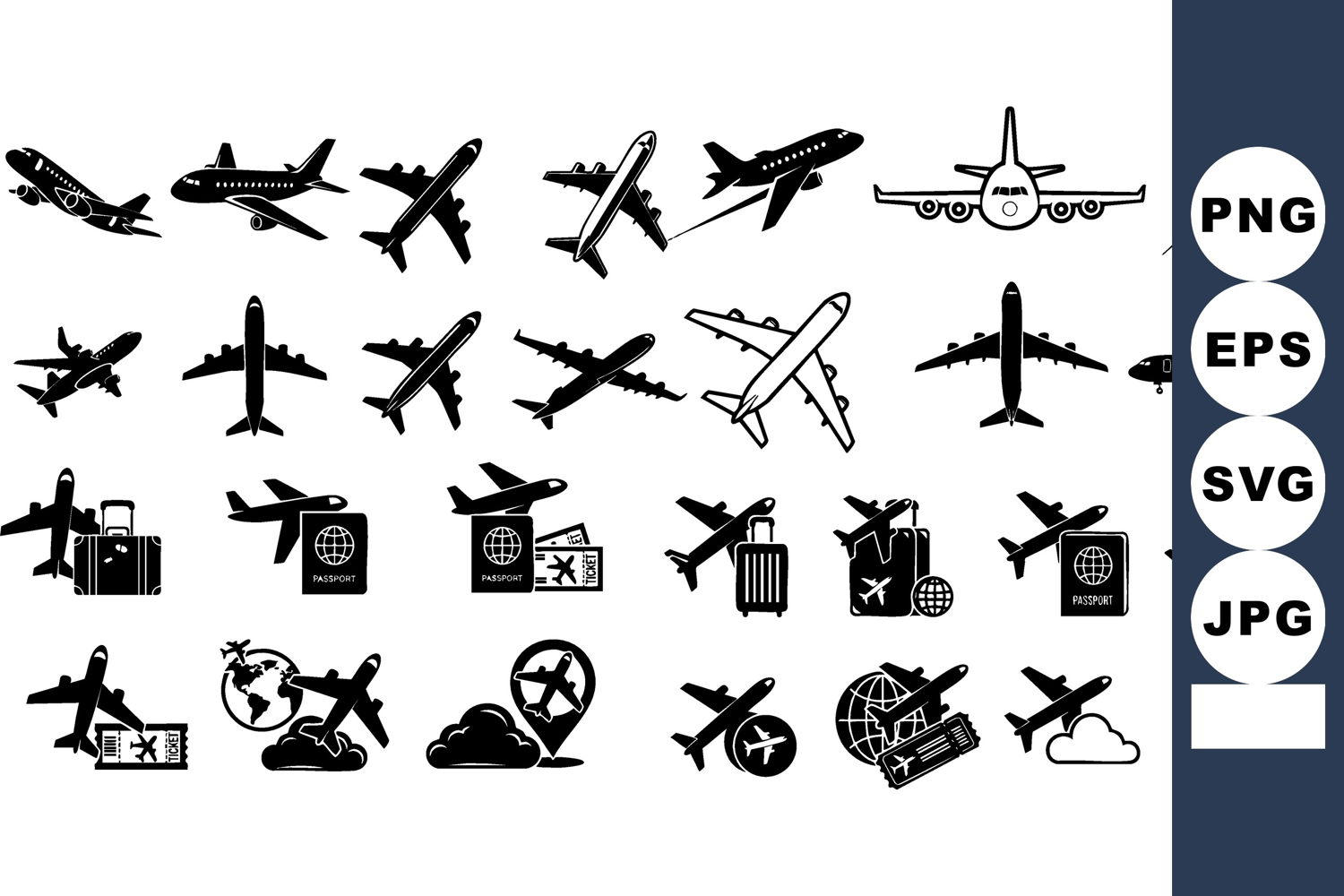 This vector file shows various airplane travel icons including planes, luggage, passports, tickets, and flight routes in bold black silhouette. Modern.