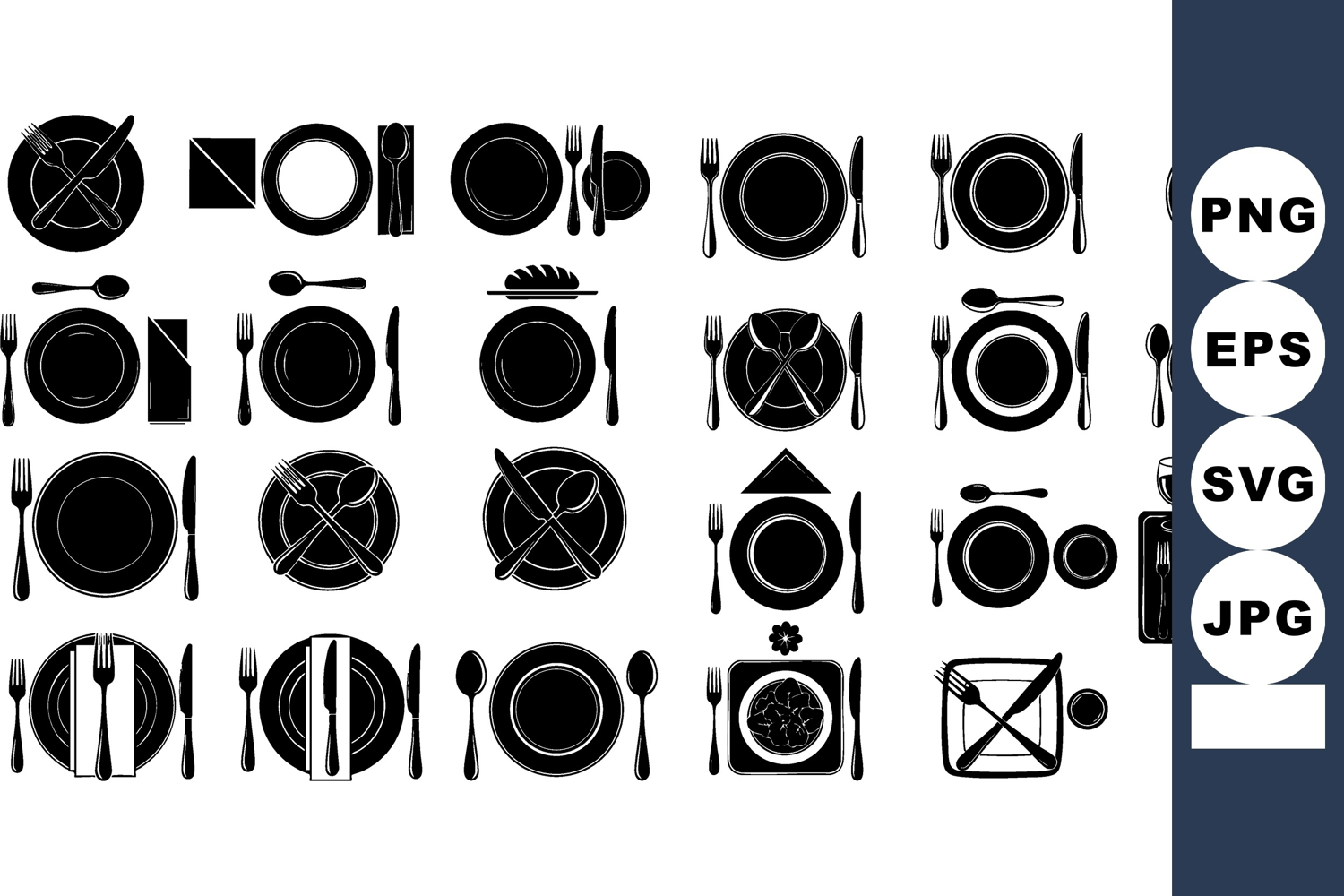 This vector illustration shows diverse table setting icons with plates, cutlery, cups, and napkins, perfect for dining, restaurant, or catering themes, modern mood.