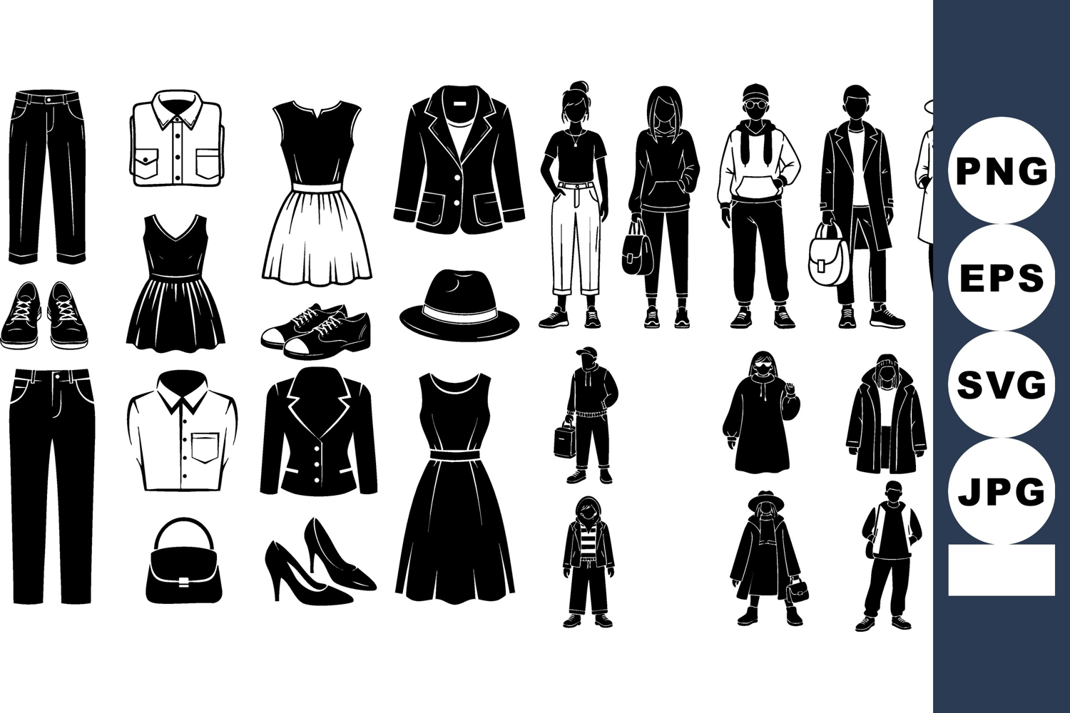 This vector shows various clothing pieces, accessories, and people dressed in modern outfits, all in black silhouette style, feeling stylish.