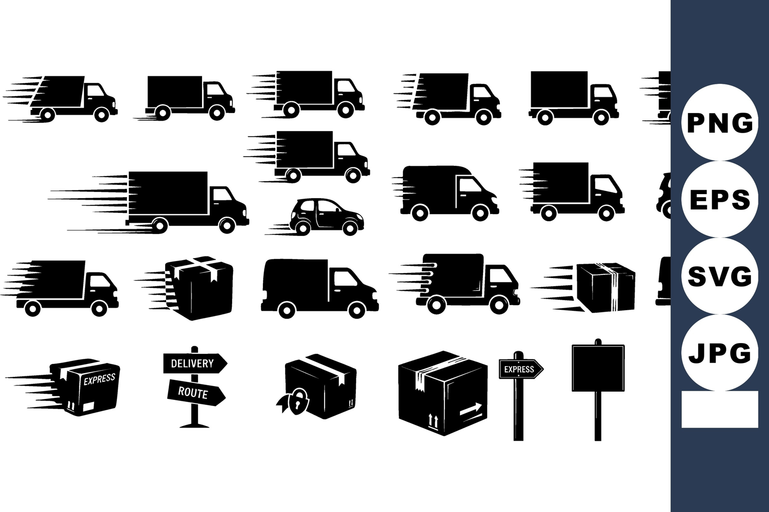 This vector set presents delivery trucks, moving cars, parcels, and shipping icons in black silhouette style, conveying a dynamic, efficient mood.