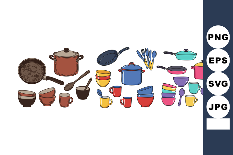 This vector shows assorted kitchen cookware including pots, pans, cups, bowls, and utensils in various bright colors, appearing playful.