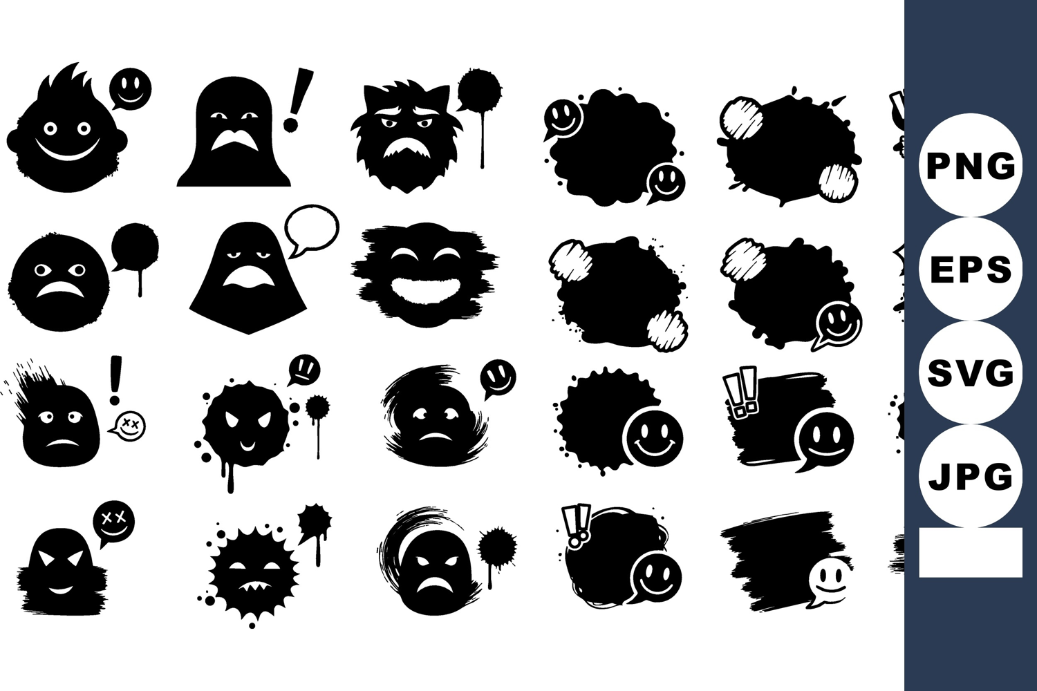 This vector features grunge brush stroke emoticon faces in various moods, including speech bubbles and expressive details, perfect for creative projects. Playful.