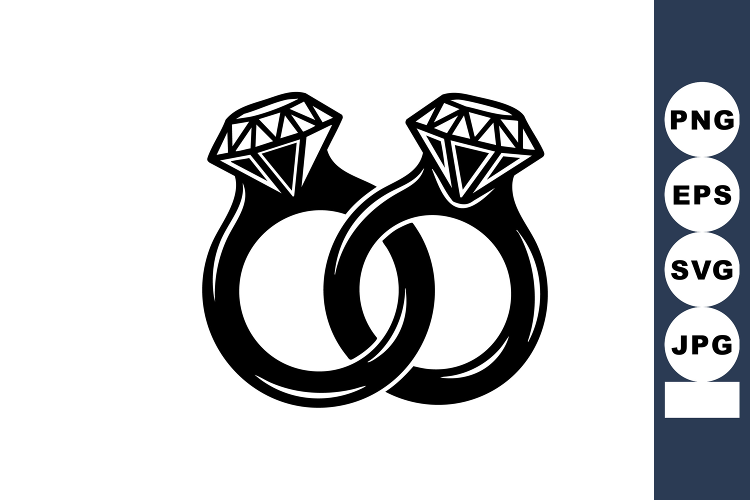 Illustration shows two black diamond engagement rings intertwined representing love and marriage in a simple style, conveying romantic mood.