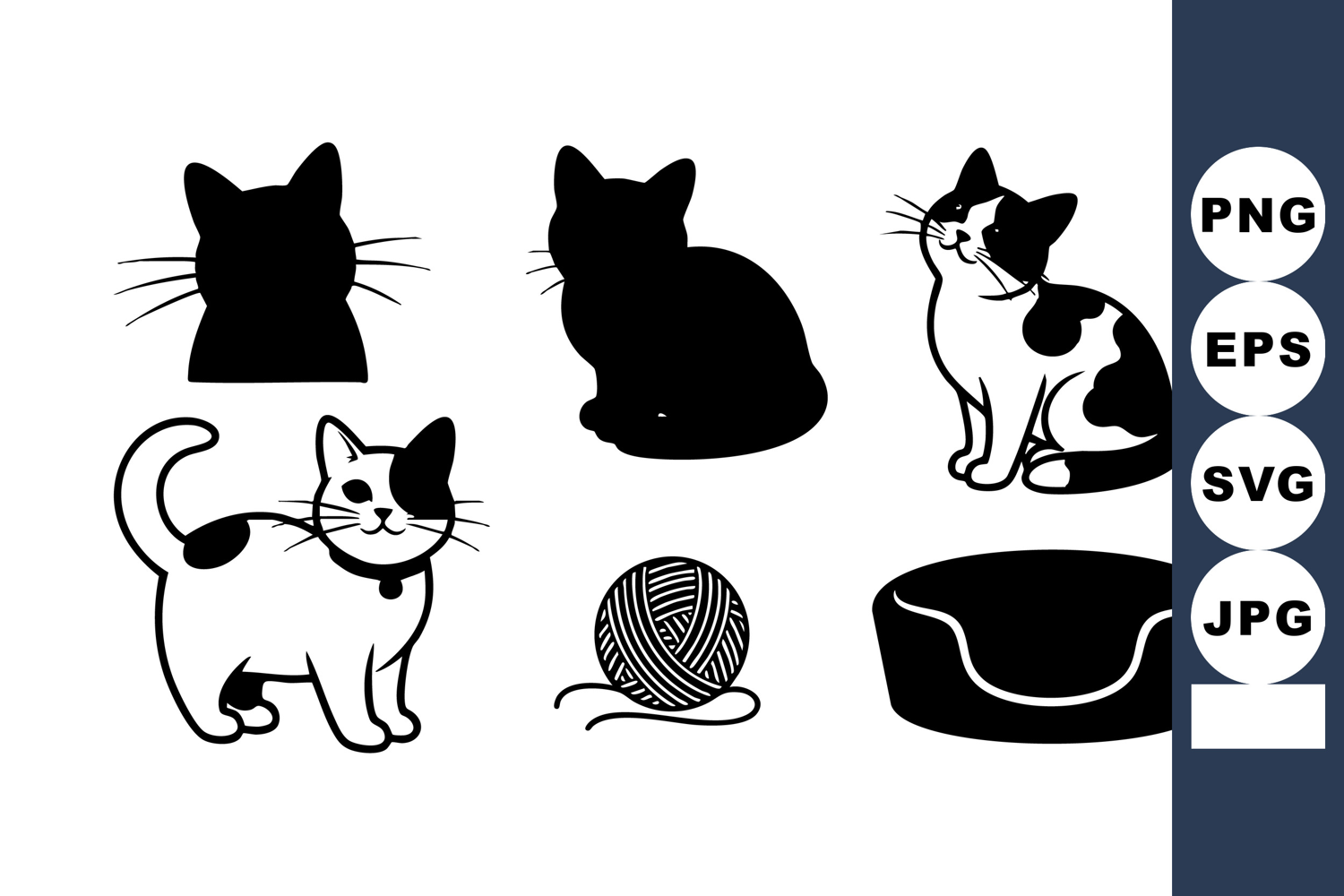 Vector illustration shows cat silhouettes in various poses with yarn ball and bed, capturing playful and relaxed feline moods. Calm ambiance.