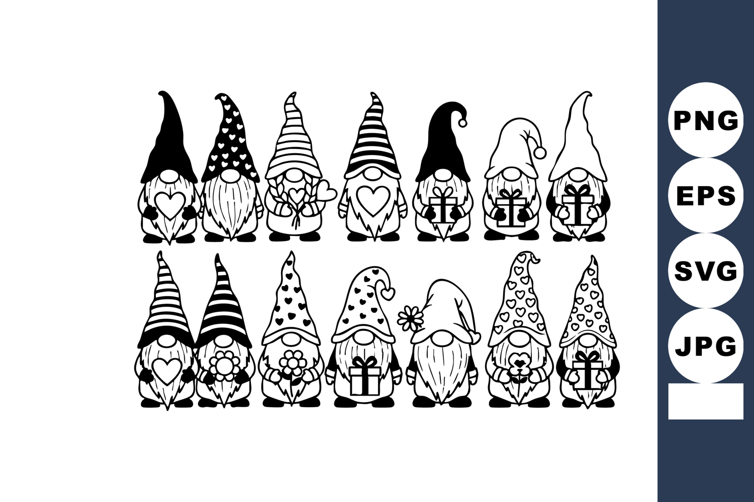 This black and white vector image shows cartoon gnomes with hats holding hearts and gifts in two rows, creating a cheerful and playful mood.