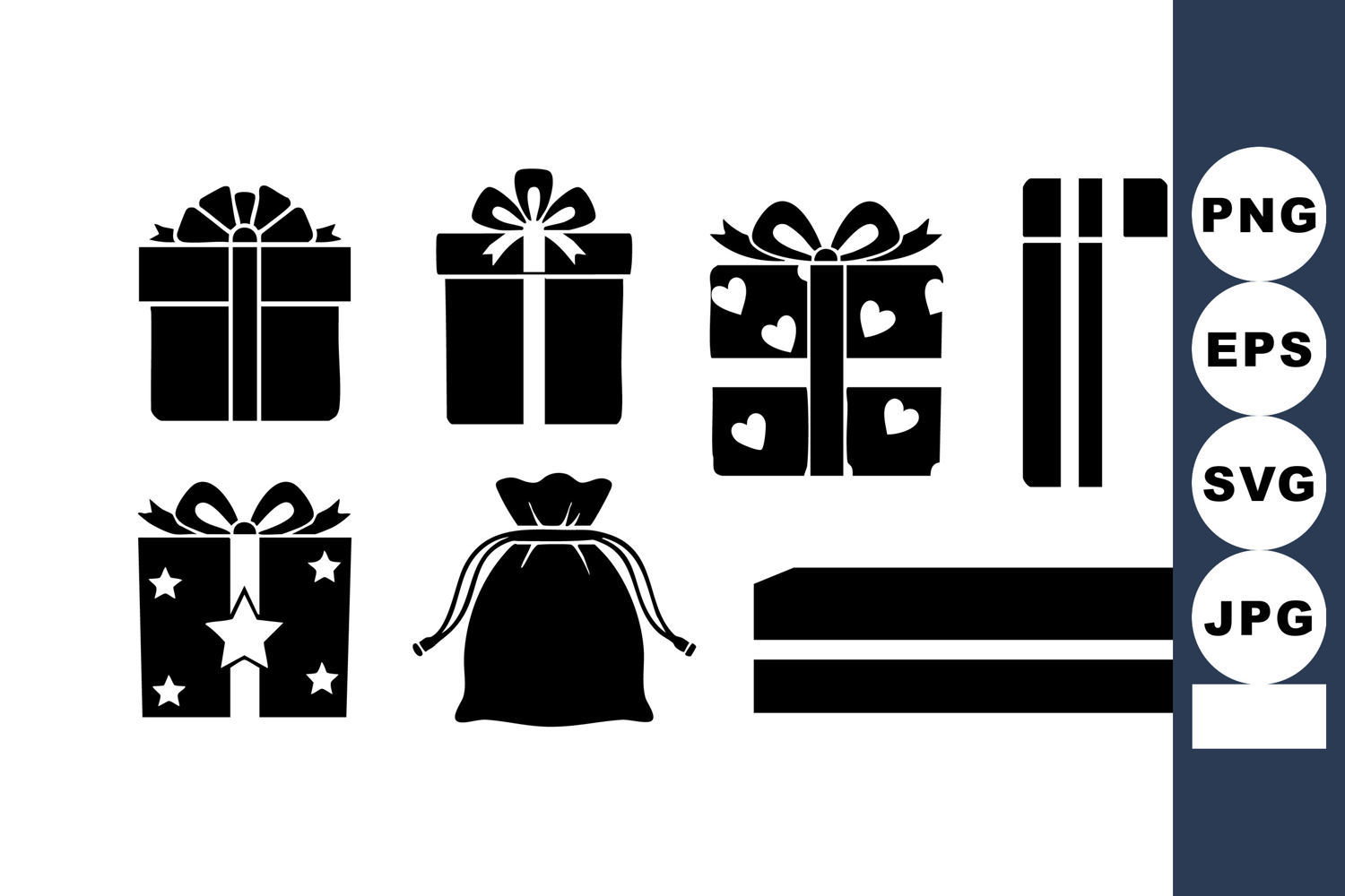 This vector illustration shows various gift boxes and a gift bag with ribbon decorations in black silhouette style, conveying celebration and festivity mood.