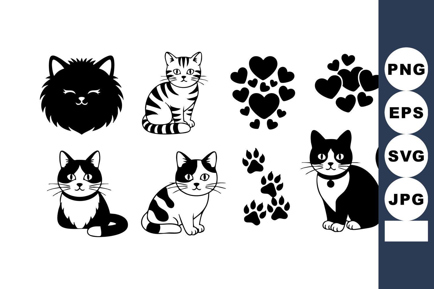 Vector illustration shows six cute cats with various paw prints and heart shapes in black and white, creating a playful and charming mood.