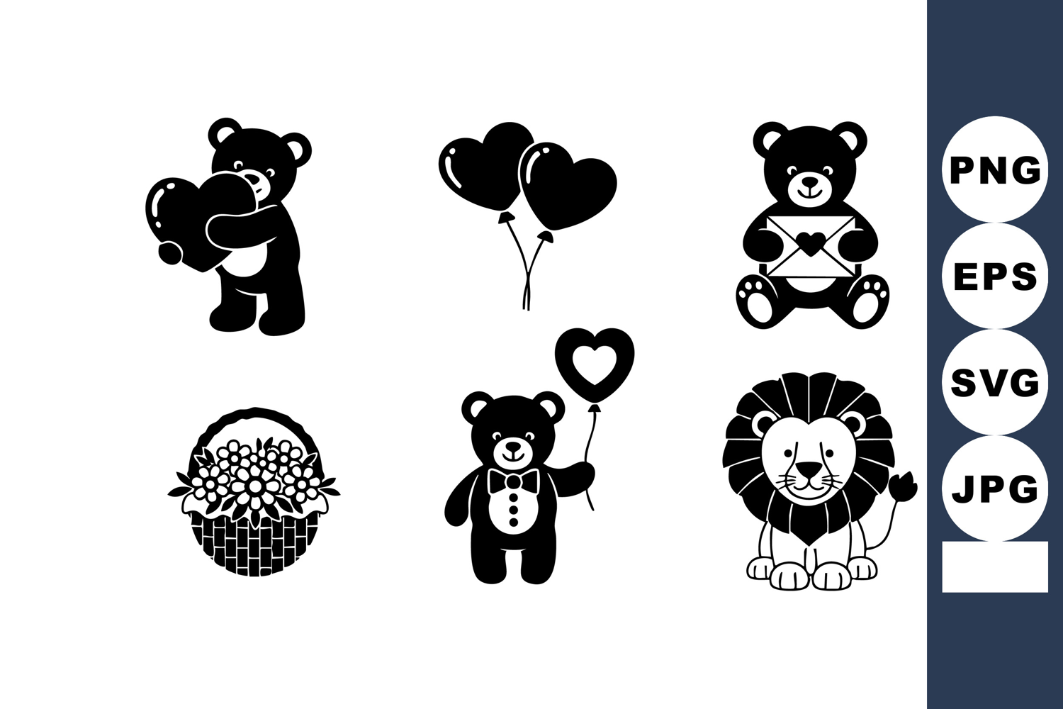 This vector illustration features teddy bears with hearts, balloons, flowers, and a lion in black silhouette style, creating a charming romantic mood.