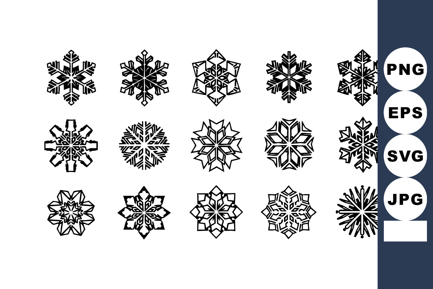 Set of black and white snowflakes with unique symmetrical designs representing winter season in a clean vector style. Calm and crisp.