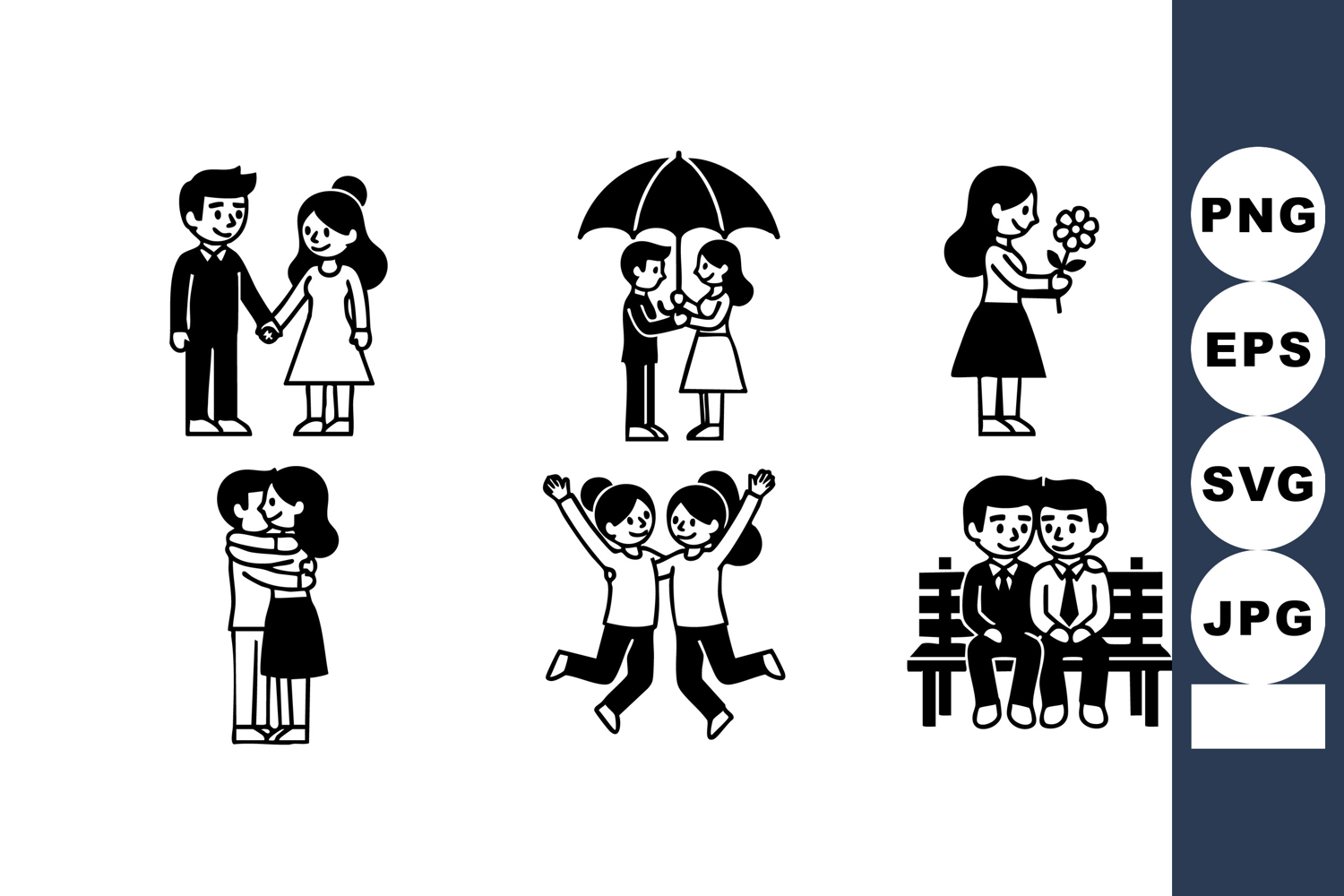 Vector illustration shows romantic couple holding hands, hugging, sitting on bench, giving flowers, jumping with joy in black and white style, joyful mood.
