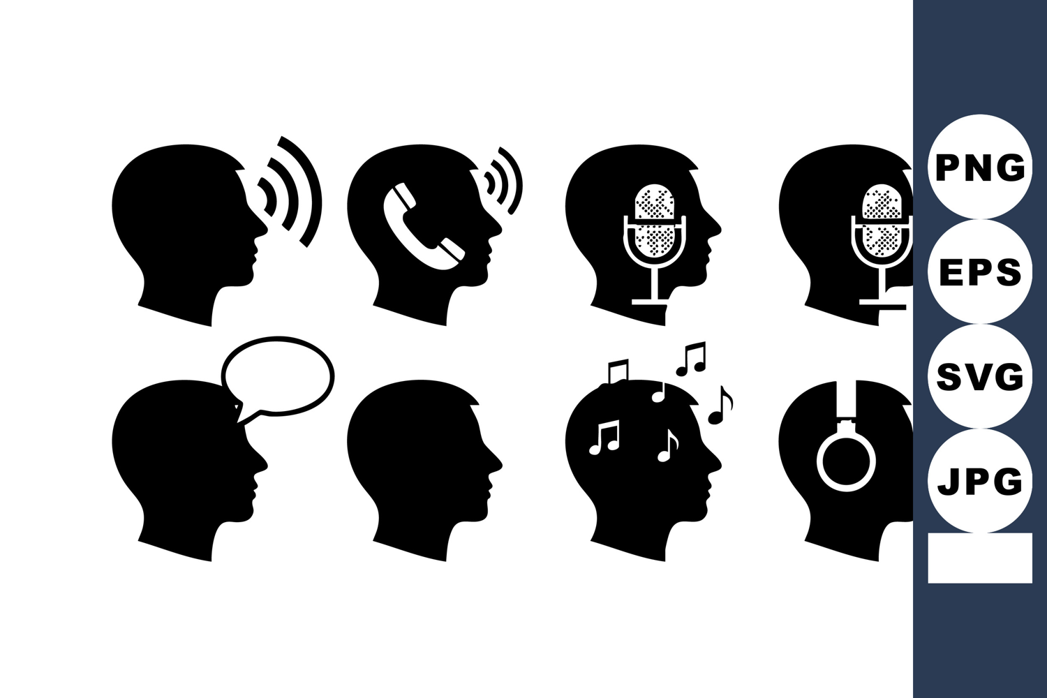 This vector set features black silhouette icons of human heads with speech, voice, and music symbols representing communication and sound. Calm.