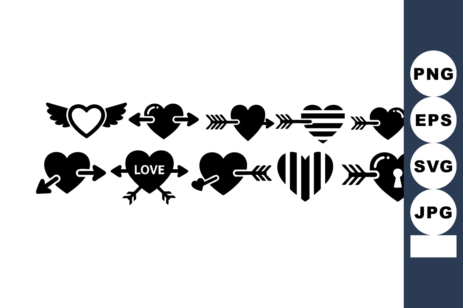 Love heart icons with arrows and wings in black silhouette s example image 1