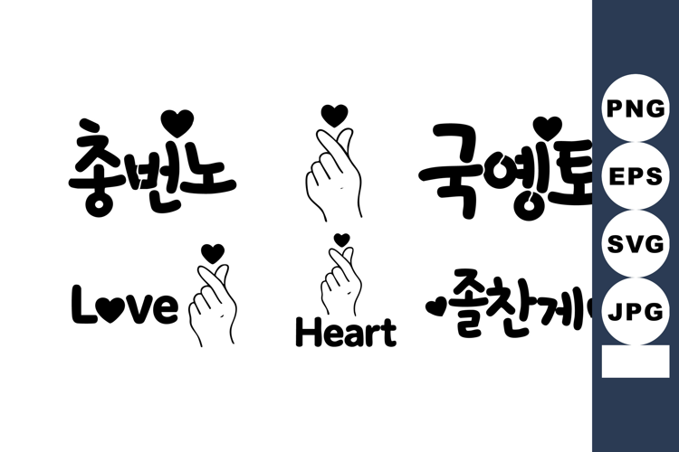 Vector illustration of Korean hand heart gesture symbols with English and Korean love and heart text in black. Simple and expressive style. Cheerful mood.
