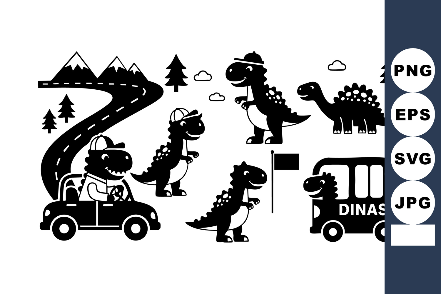 Vector illustration shows cartoon dinosaurs walking and driving along a winding road with trees and clouds. The mood is playful.