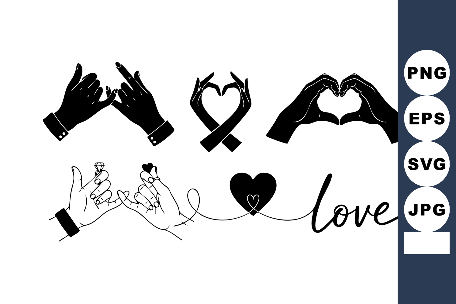 Vector illustration shows hands creating heart shapes, pinky promises, and a love ribbon with a connected heart and word love, romantic mood.