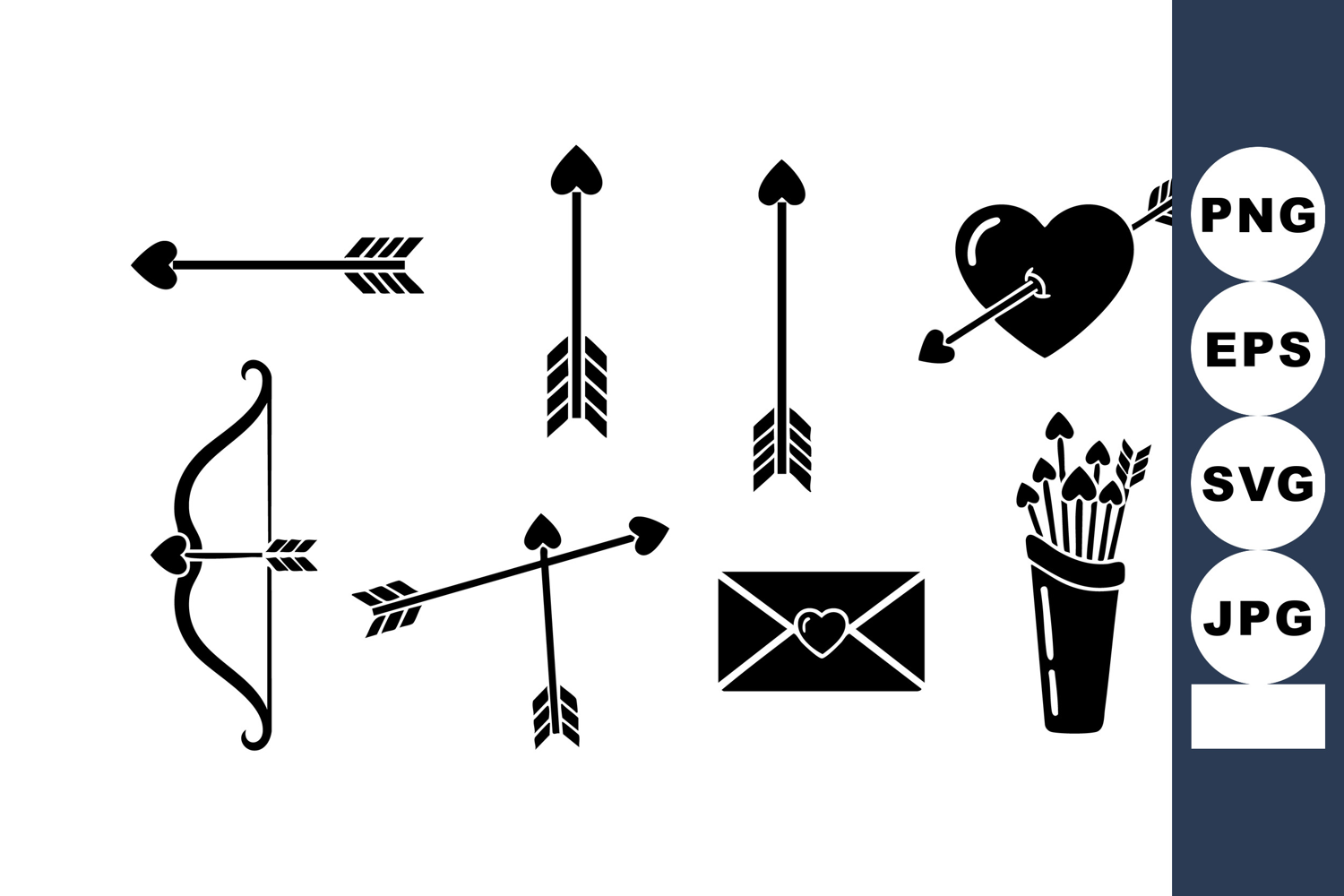 Vector set shows cupid arrows, heart with arrow, bow, envelope with heart, and quiver with arrows in black silhouette style. Romantic mood.